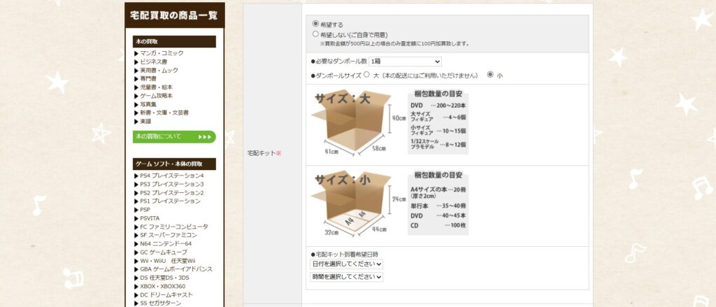 まずは公式サイトから申込み。ダンボールも一緒に頼めるので、家にない方も安心です。私はサイズ小を頼みましたが、商品が多い方は2~3箱 or サイズ大がオススメ!